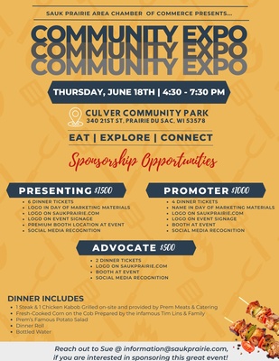 Join the Sauk Prairie Area Chamber of Commerce for the Community Expo on Thursday, June 18, from 4:30?7:30 PM at Culver Community Park in Prairie du Sac. This signature summer event brings together local businesses, nonprofits, organizations, and the community for an evening of connection, discovery, and fun.